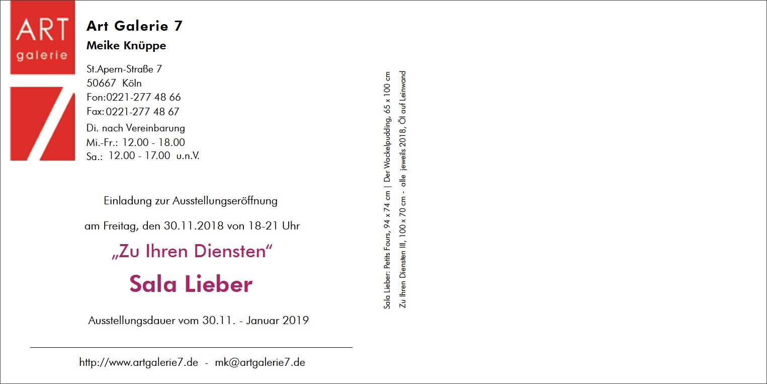 Invitation to the opening of Sala Lieber’s solo exhibition ‘At Your Service’ at Art Galerie 7 in Cologne on Friday, November 30, 2018, from 6 to 9 p.m.