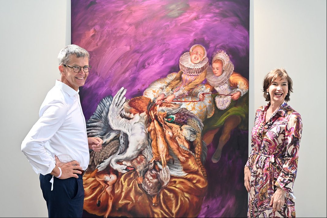 Thomas Gottschalk und Carina auf der Art Karlsruhe am Stand der ART Galerie 7 vor den Werken von der Künstlerin...