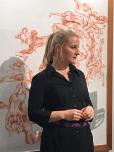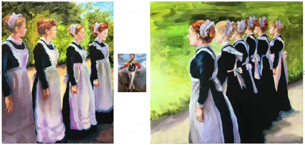 Sala Lieber addresses even serious topics with a great deal of humor and a touch of irony. The paintings in her current series, titled “At Your Service,” deal with hierarchies in the working world. The work “Triptych” shows a small-format master of the house in provocative contrast between the rows of his oversized painted servants. In the picture “The Gardener Has Fallen Down,” the viewer casts a cynical-erotic gaze from the window onto a naked working gardener. On the one hand, it is about playing with power and hierarchies, but not only in the traditional sense. Certainly, the management of property would not be possible without the services of servants. So the question arises: Who is dependent on whom?