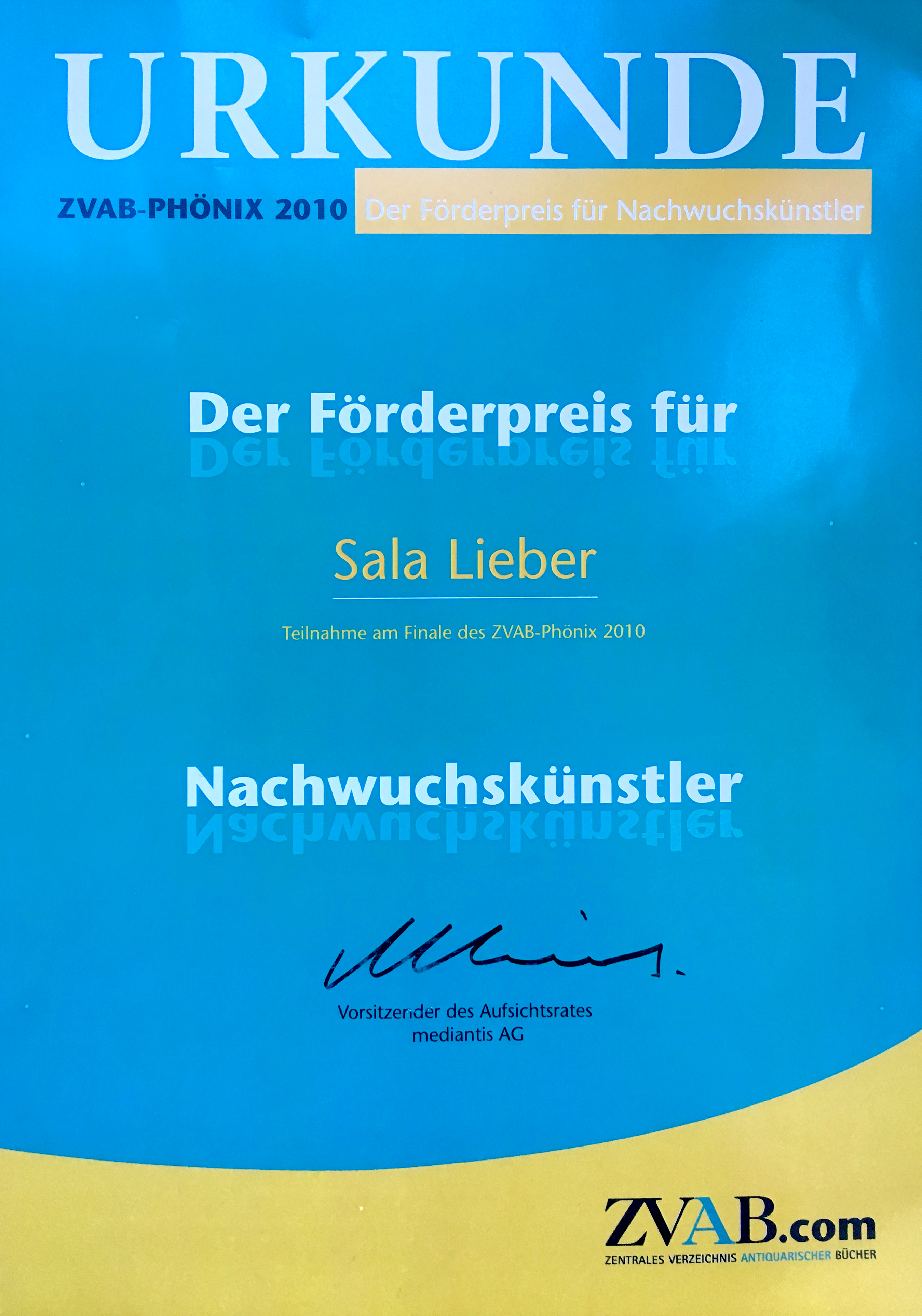 ZVAB-Phönix Förderpreis für Nachwuchskünstler 2010 Im Mai 2010 erhielt Sala Lieber den Förderpreis des ZVAB-Phönix für Nachwuchskünstler. 28. Mai 2010 Sala Lieber in Auszeichnungen, Nicht kategorisiert 0 Like No Comments